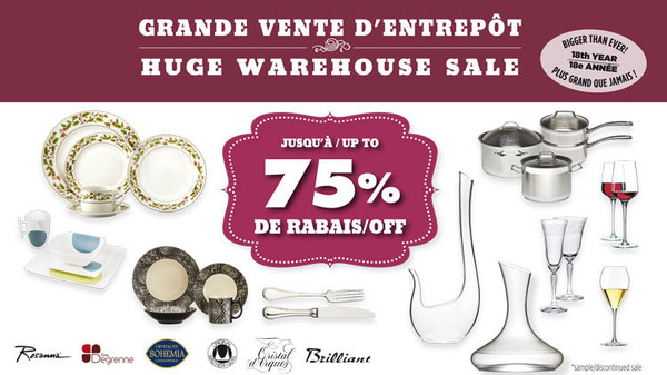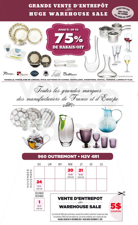 Les 20, 21, 24 nov. et 1 déc., grande vente d'entrepôt de vaisselle, porcelaine de Limoges, batteries de cuisine, coutellerie, cristal, lampes et plus! Rabais jusqu'à 75% sur les plus grandes marques. Coupon rabais de 5$ avec achat de 50$ & plus.