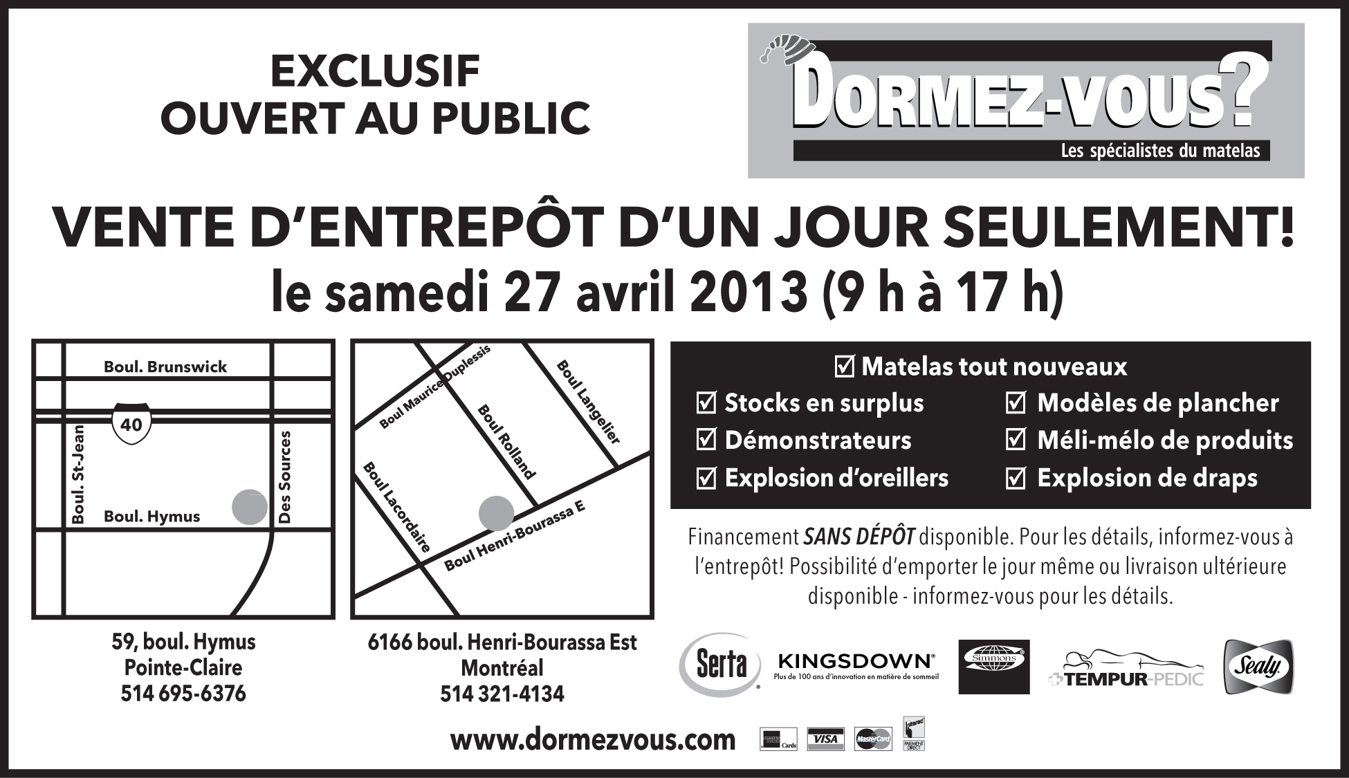 Ce samedi 27 avril aura lieu la vente d'entrepôt d'un jour de Dormez-vous! Sur place vous trouverez des matelas neufs, surplus, démos, oreillers, literie, modèles de plancher, produits mix & match. Serta, Seally, TempurPedic, Simmons, Kingsdown.