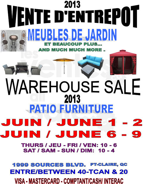 Vente d'entrepôt de meubles de jardin du 1er au 9 juin. Préparez-vous à profiter de l’été en vous procurant tout ce qu'il faut à petit prix : ensemble de patio, gazébo, hamac, fauteuils et causeuses d'extérieur et plus!