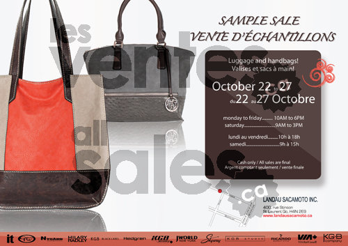 Landau Sacamoto vous invite à sa vente d’échantillons biannuelle qui se tiendra du 22 au 27 octobre prochain. Profitez de rabais allant jusqu’à 70% sur leurs sacs à main, porte-monnaie, valises et sacs à dos! Ne manquez pas cette occasion unique!