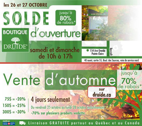 Méga vente en ligne DRUIDE de 4 jours seulement, du 25 au 28 octobre! Vous économiserez jusqu'à 70%* sur une vaste sélection de produits de soins corporels québécois, certifiés biologiques. Soins pour bébé, soins du visage, bains moussants et plus.