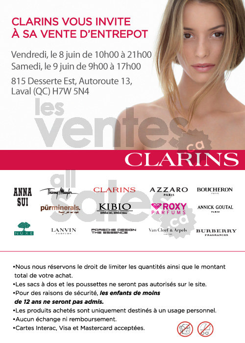 Clarins vous invite à sa vente d’entrepôt! Ne ratez pas cette occasion unique de découvrir un vaste choix de parfums et de cosmétiques. Des marques de prestige à des prix imbattables : Roxy, Clarins, Anna Sui, Burberry, Annick Goutal Paris, Kibio …