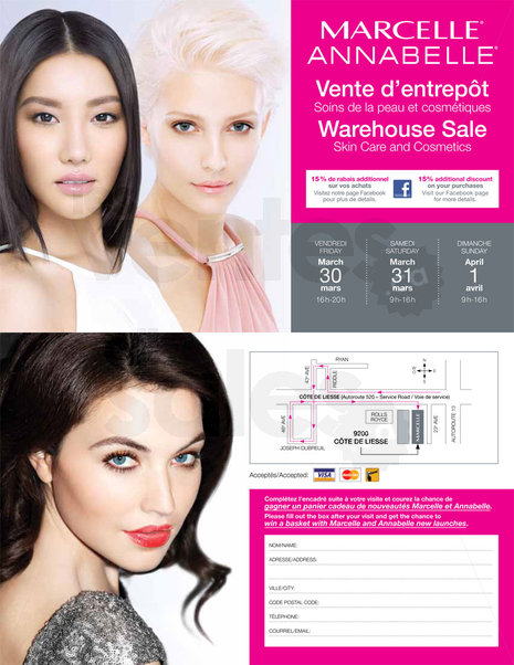 Du 30 mars au 1er avril, c'est la vente d'entrepôt Marcelle et Annabelle! Profitez de l'occasion pour faire le plein de produits de soins pour la peau et de cosmétiques de ces deux marques de qualité reconnues.
