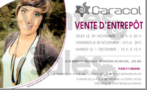 Du 29 novembre au 1er décembre, ce sera la vente d'entrepôt Caracol. Parfaits pour offrir en cadeau ou pour se gâter, nos colliers, bracelets, boucles d’oreilles, bagues et accessoires mode sauront vous ravir! Aubaines à partir de 3$.