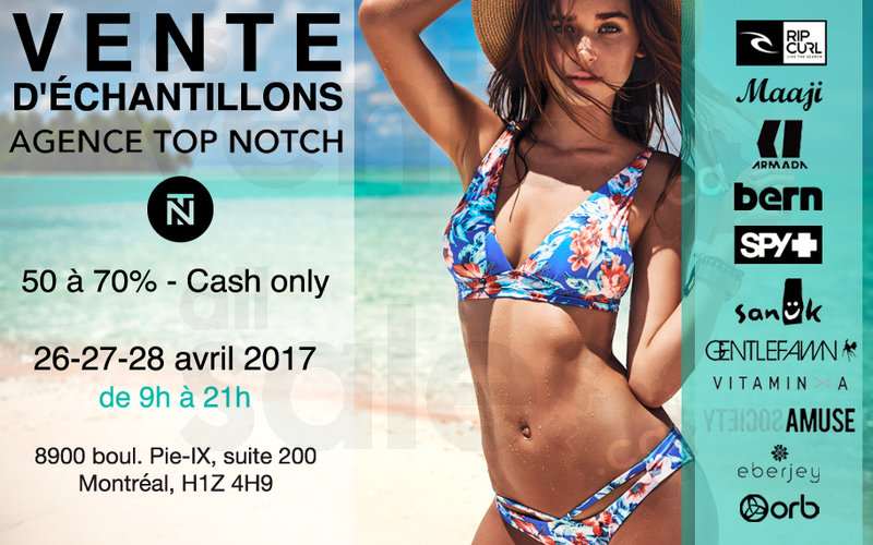 Vente d'échantillons à l'Agence Top Notch du 26 au 28 avril. Vêtements, maillots, lunettes de ski/soleil, casques de ski/snow, lingerie, souliers, manteaux d'hiver et plus. Marques: Rip Curl, Maaji, Armada, Bern, Spy, Gentle Fawn, Vitamin A...