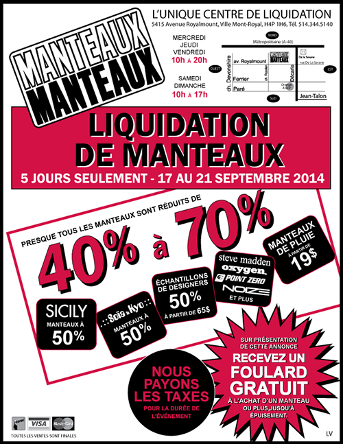 Grande liquidation de manteaux au Centre de liquidaiton de Manteaux Manteaux. Du 17 au 21 septembre, profitez de rabais de 40% à 70% sur presque tous leurs manteaux. Tailles disponibles : TTP à TTTG.
