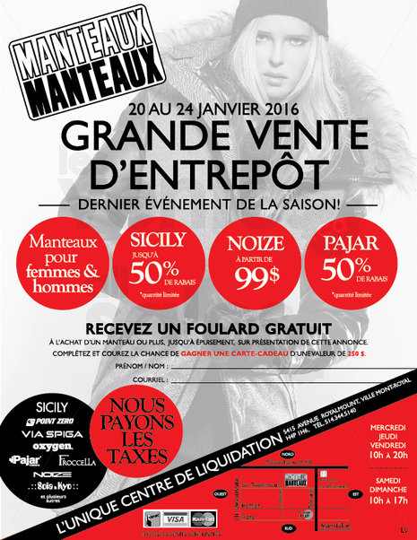 Grande vente d'entrepôt pour hommes et femmes au Centre de liquidation de Manteaux Manteaux du 20 au 24 janvier: manteaux Sicily* jusqu'à 50% de rabais, manteaux Noize à partir de 99$, manteaux Pajar* à 50% de rabais. De plus, nous payons les taxes!