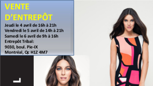 La vente d'entrepôt et d'échantillons de vêtements prêt-à-porter pour femmes TRIBAL se tiendra les 4, 5 et 6 avril prochains. Prix à partir de 6$! Vaste sélection de vestons, hauts, pantalons et jupes, tailles 2 à 18 et XS à XXL. Venez nous voir!