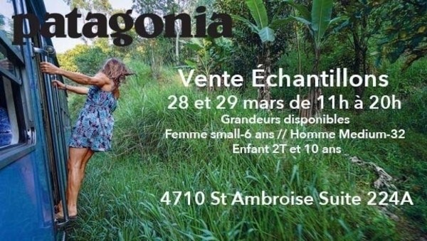 C'est la grande vente d'échantillons de Patagonia les 28 et 29 mars 2019 à Montréal! Obtenez des économies incroyables sur les vêtements et accessoires pour femmes, hommes et enfants.