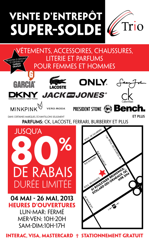 À partir du 4 mai, venez visiter notre nouveau magasin de liquidation à DDO! Chandails, pantalons, jeans, vestes, parfums et accessoires de marques pour hommes et femmes, en réduction jusqu'à 80% : Lacoste, Mink Pink, Bench, President Stone...