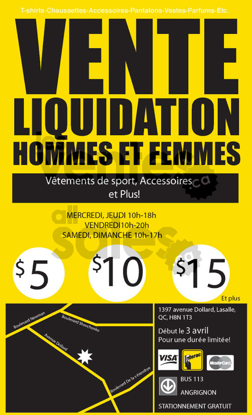 Venez visiter notre centre de liquidation à LaSalle! Chandails, pantalons, jeans, vestes, parfums et accessoires de marques pour hommes et femmes à très bas prix 5$, 10$, 15$ et plus. Pour une durée limitée seulement!