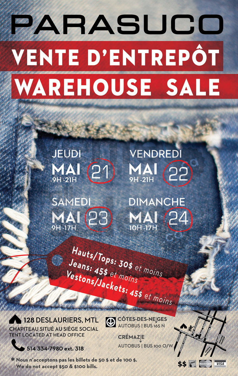 La grande vente d'entrepôt Parasuco est de retour du 21 au 24 mai! Pour 4 jours seulement au siège social! Échantillons exclusifs et nouveaux arrivages à tous les jours pour hommes et femmes : jeans, vestons et hauts tendance.