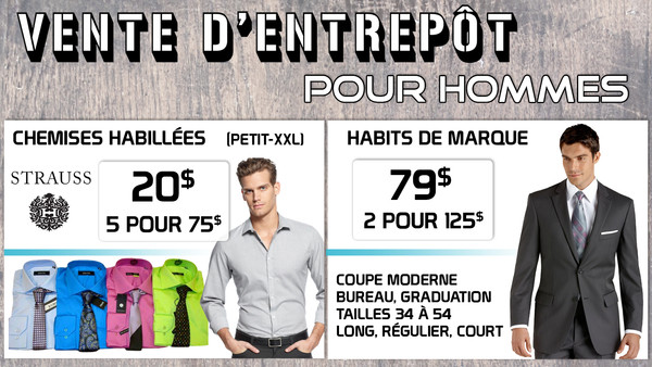 Méga vente d'entrepôt pour hommes! Habits de marque à seulement 79$ ou 2 pour 125$! Coupe moderne, tailles 34 à 54 - long, régulier et court. Excellente sélection pour graduation, bureau, ect. Aussi, chemises habillées Hörst & Strauss 20$ ou 5/75$.