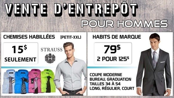 Méga vente d'entrepôt pour hommes! Habits de marque à seulement 79$ ou 2 pour 125$! Coupe moderne, tailles 34 à 54 - long, régulier et court. Excellente sélection pour graduation, bureau, ect. Aussi, chemises habillées Hörst & Strauss 15$ seulement!