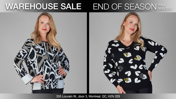 Vente de vêtements d'importation pour dames, 3 jours seulement les 5-6-7 décembre 2025. Jusqu'à 80% de rabais sur des vêtements de marques connues d'une qualité supérieure. Fermeture de saison, tout doit être vendu! Plus