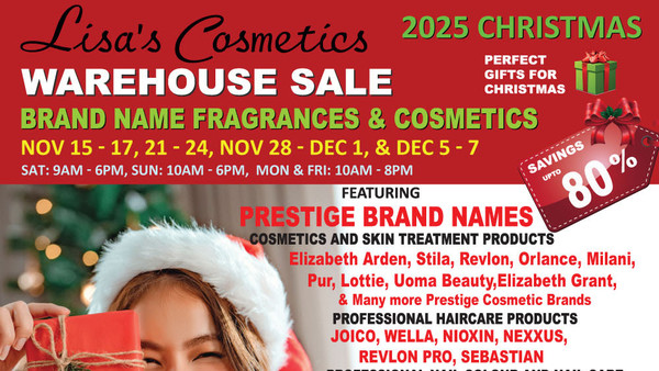 Vente d'entrepôt de Noël Lisa's Cosmetics! Novembre: 15 au 17, 21 au 24, du 28 novembre au 1er décembre et du 5 au 7 décembre. Rabais jusqu'à 80% sur une vaste sélection de cosmétiques & parfums des plus grandes marques! Plus