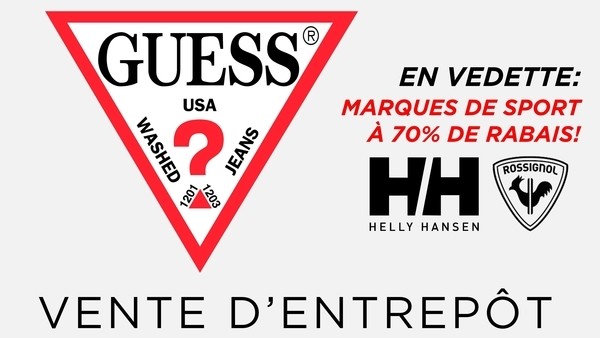 Nous vous invitons à la Vente d'Entrepôt GUESS? à Montréal! Grande Sélection de Jeans, Robes, Jupes, Hauts, Pantalons, Manteaux et Vestes - pour Hommes, Femmes et Enfants! En Vedette: Helly Hansen, Rossinol et Plus à 70% de rabais!! Plus