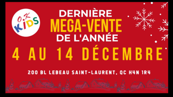 La méga vente d'entrepôt OK KIDS est de retour du 4 au 14 décembre 2025! Très grande sélection de vêtements et accessoires pour enfants de 0 à 16 ans. Venez voir notre nouvelle marchandise pour les Fêtes! Plus