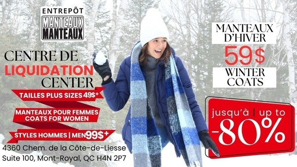 Obtenez jusqu'à -80% à la vente d'entrepôt Manteaux Manteaux. Vestes d'hiver pour femmes en liquidation à partir de 59$ & vêtements à -50% avec -30% additionnel. Des rabais sur des styles pour hommes 99$ et plus, et pour tailles plus à partir de 59$. Plus