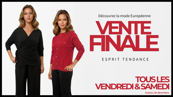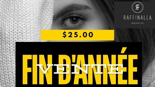 Grande vente de fin d’année Raffinalla, 2 jours seulement les 6-7 décembre! Pantalons, jeans, vestes, tricots, hauts, jupes et robes à 25$. Manteaux 150–400$. Faites le plein de vos favoris! Articles en stock, offre exclusive à la vente d'entrepôt. Plus