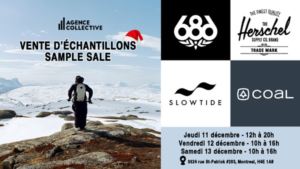 Ne manquez pas la vente d'échantillons Agence Collective le 11-12-13 décembre prochain! Vente des Marques: - 686 Outerwear - Herschel - Coal - Slowtide - Plus