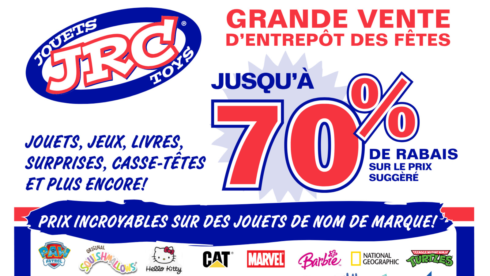 Magasinez vos cadeaux à la grande vente d'entrepôt de jouets JRC du 8 octobre au 24 décembre 2025! Jusqu'à - 70% sur des jeux, jouets, livres, casse-têtes, etc. Pat'Patrouille, Hello Kitty, Marvel, CAT, Nerf, Pokémon, Playmobil, Mattel et plus. Plus