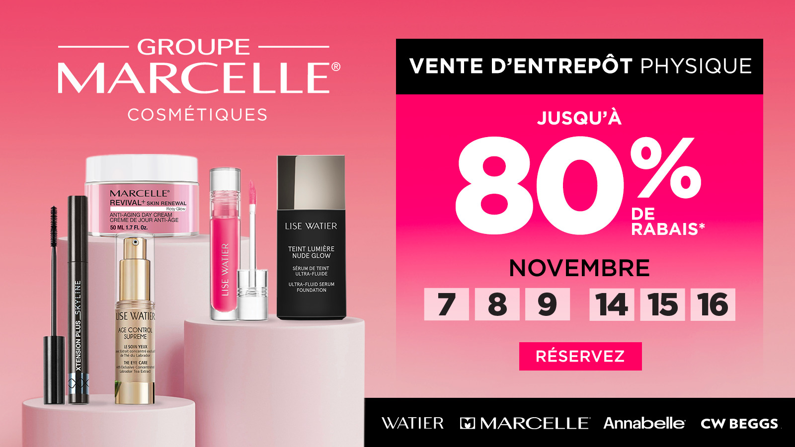 La vente d'entrepôt physique du Groupe Marcelle est de retour! Économisez jusqu'à 80% de rabais sur vos marques favorites: Watier, Annabelle, Marcelle et CW Beggs. Maquillage, soins de la peau et parfums. Plus