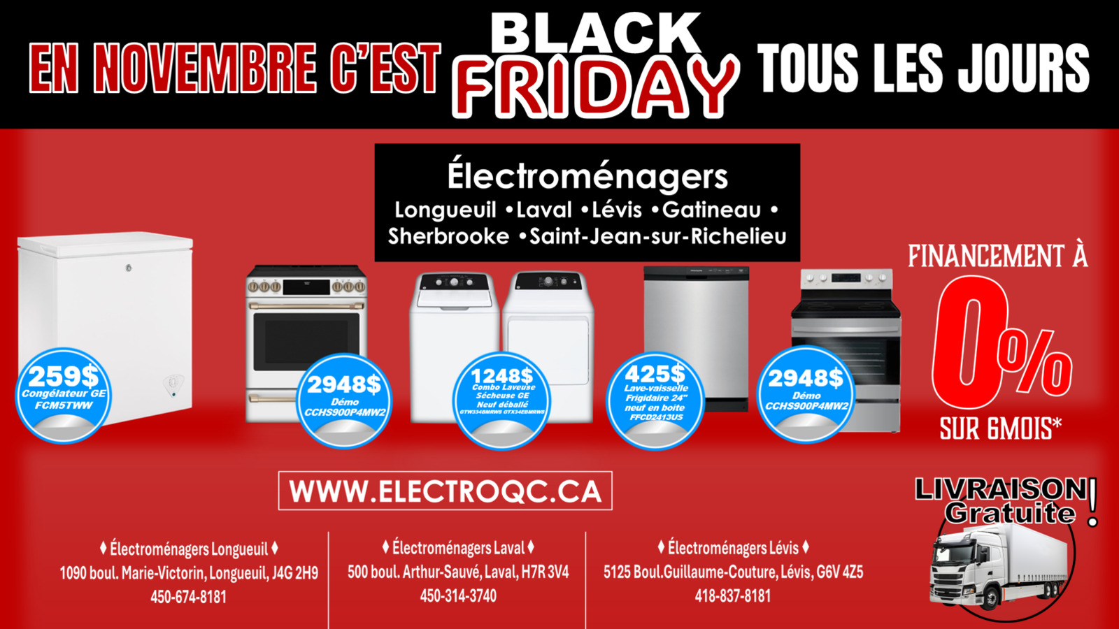 Vendredi Fou tout le mois de Novembre! * Financement 0% + livraison gratuite jusqu'au 30 novembre. Plus