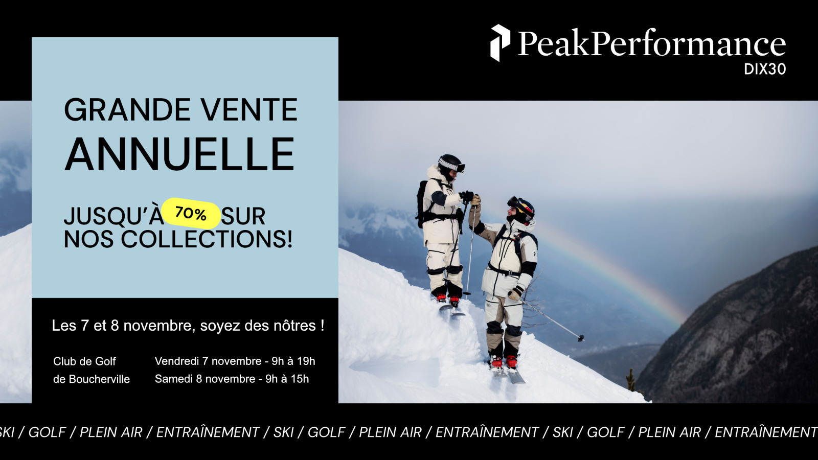 C'est le retour de la méga vente Peak Performance DIX30 les 7 et 8 novembre! Profitez de rabais allant jusqu'à 70% sur nos collections, ski, golf & plein air. 🤩 Plus