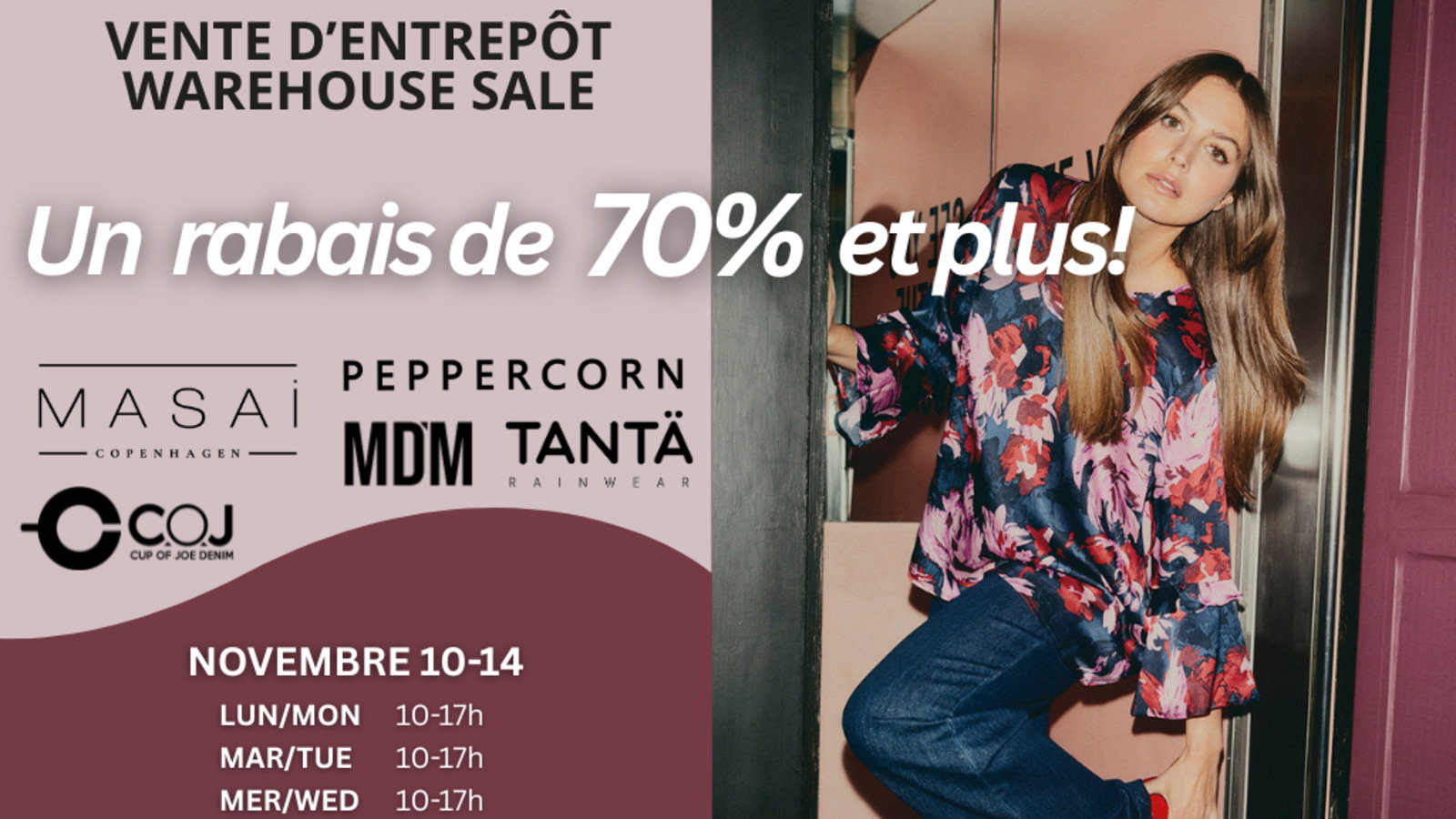 Notre fameuse Vente d’entrepôt est de retour! Du 6 au 9 novembre, profitez de -80% sur une incroyable sélection pour hommes, femmes, garçons et maternité (quantités limitées), une vaste sélection d'échantillons et plus! Tous à prix imbattables! Plus