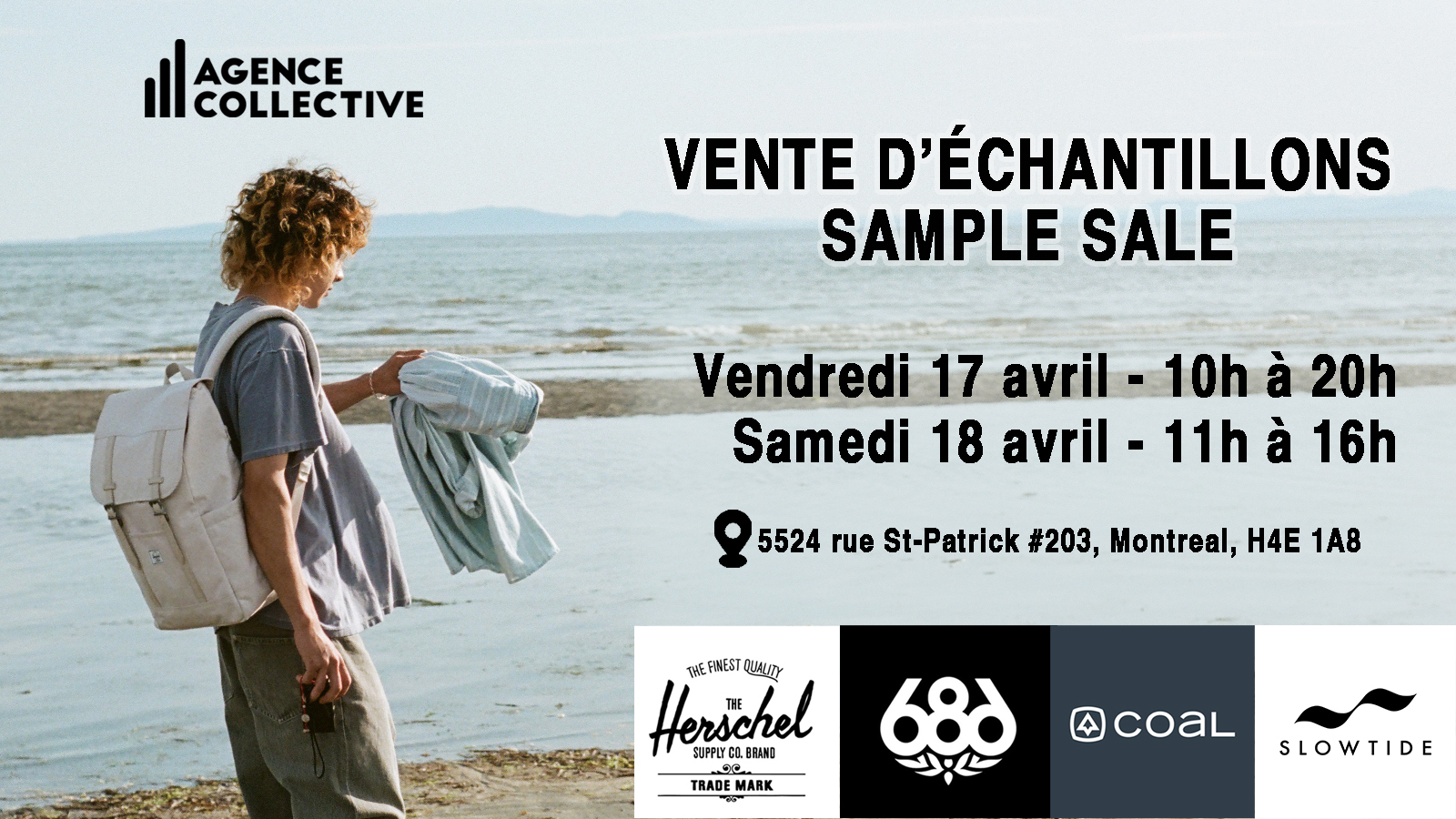 La vente du printemps de l'Agence Collective est de retour! RABAIS de 50% à 80%!!! Vendredi 17 AVRIL & Samedi 18 AVRIL Deux Jours seulement! Herschel, 686 Apparel, Coal Headwear, Slowtide. Plus