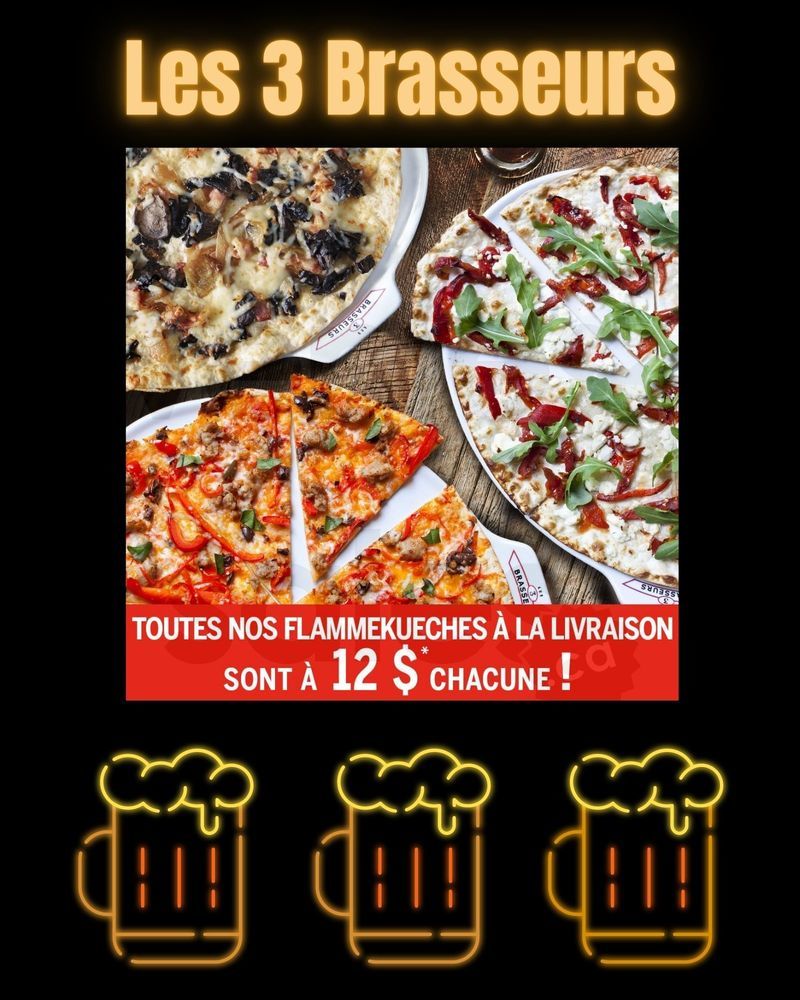 Flammekueches à 12$ en livraison jusqu'au 20 janvier! Passez un bon moment à la maison avec des délicieux repas les 3 brasseurs.