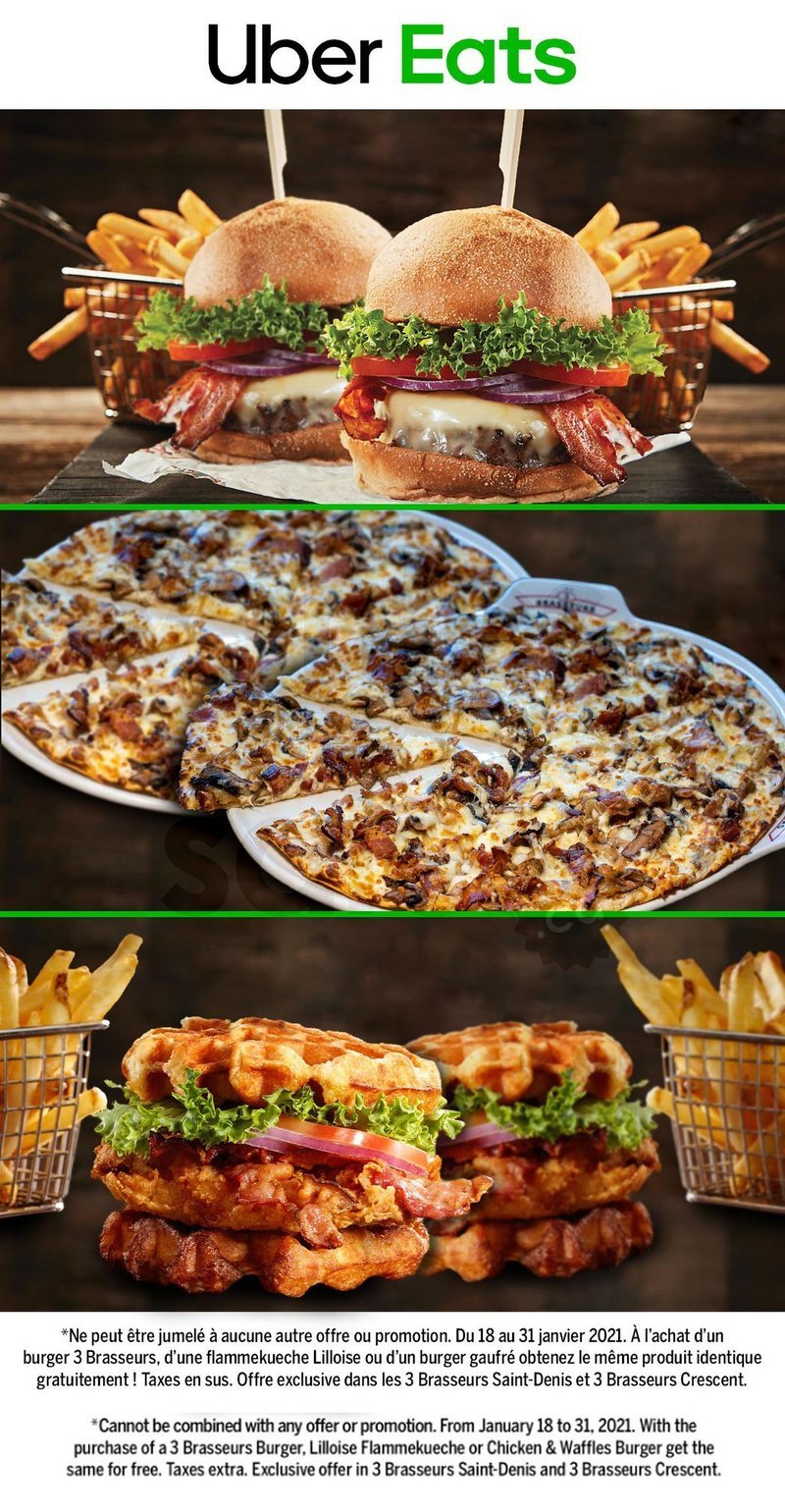 2 POUR 1 sur le burger 3 Brasseurs, la flammekueche lilloise et le burger gaufré en commandant à la livraison avec Uber Eats jusqu'au 31 janvier 2021!