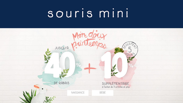 Du 27 avril au 1er mai, profitez de rabais du printemps chez Souris Mini! Obtenez jusqu’à 40% de rabais sur les articles naissance ou bébé sélectionnés. Obtenez 10% de rabais supplémentaire à l'achat de 3 articles naissance ou bébé sélectionnés.