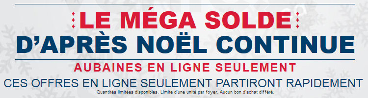 Le méga solde d'après Noël continue! Profitez d'aubaines en ligne exclusives, mais dépêchez-vous, elles partiront rapidement. Rabais en vigueur jusqu'au 1er janvier 2015.
