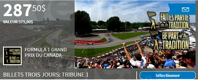 Pour un temps limité sur SHOPICO! Économisez 50% sur 1 ensemble de billets 3 jours Tribune 1 donnant l'accès au FORMULA 1 GRAND PRIX DU CANADA 2016 pour 1 personne, incluant: accès aux essais libres, qualifications & course.