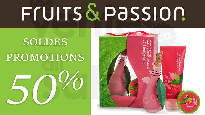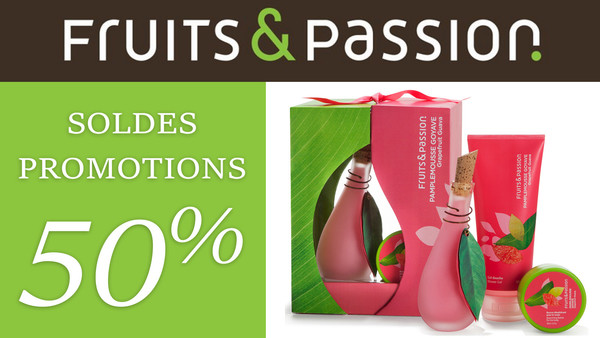 Prenez soin de vous avec les produits Fruits & Passion! Profitez de rabais jusqu'à 50% : bain moussant, crème hydratante, soins du visage, eau de toilette, produits pour la maison...