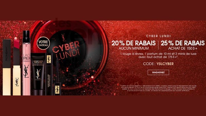 Pour une durée limitée, profitez de la promotion du cyber lundi d'Yves Saint Laurent en ligne! Obtenez un rabais de 20% sur tout achat ou un rabais de 25% sur les achats de 150$ ou plus.