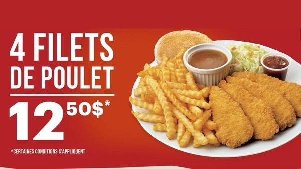 Pour un temps limité commandez une assiette de 4 filets de poulet avec les frites et salade de chou à 12,50$ chez Les Rôtisseries Benny!