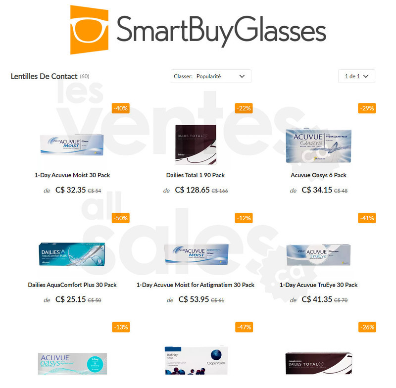 Achetez des lentilles de contact à petit prix chez SmartBuyGlasses. Économisez jusqu'à 60% sur Acuvue Moist, Dailies Total, Acuvue Oasys, Dailies AquaComfortPlus, Freshlook et plus encore!