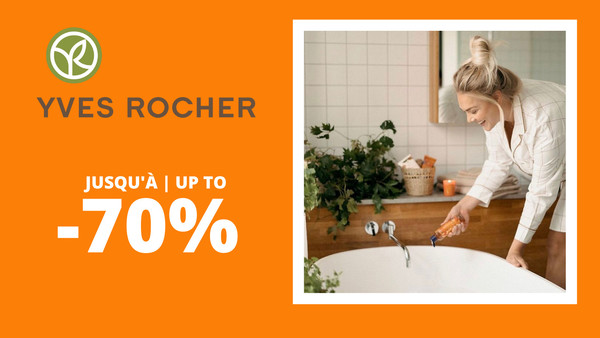 Ventes privées Yves Rocher! Jusqu'à 70% de rabais sur produits sélectionnés: soin du visage, corps et bain, maquillage, cheveux, parfum et plus encore!