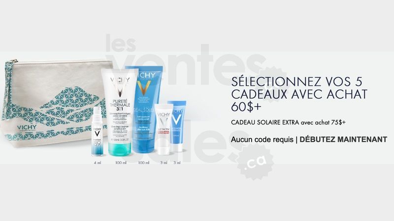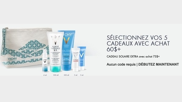 Promo Vichy en ligne! Sélectionnez vos 5 cadeaux avec achat 60$ ou plus! De plus obtenez un cadeau solaire extra avec achat 75$.