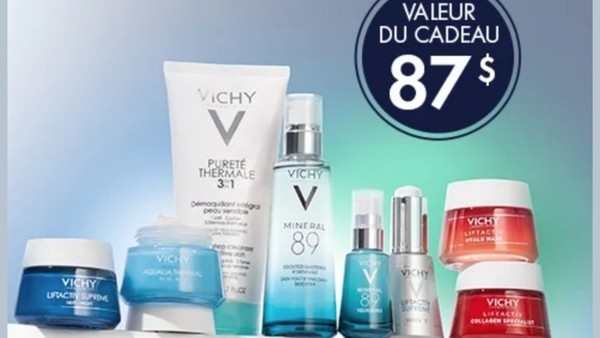 Promotion Vichy! Obtenez un rabais de 25% sur tout + obtenez un nettoyant 3-en-1 d'un format 100ml gratuit avec chaque achat + cadeau 8-pièces (valeur de 87$) avec achat 75$ ou plus après rabais.