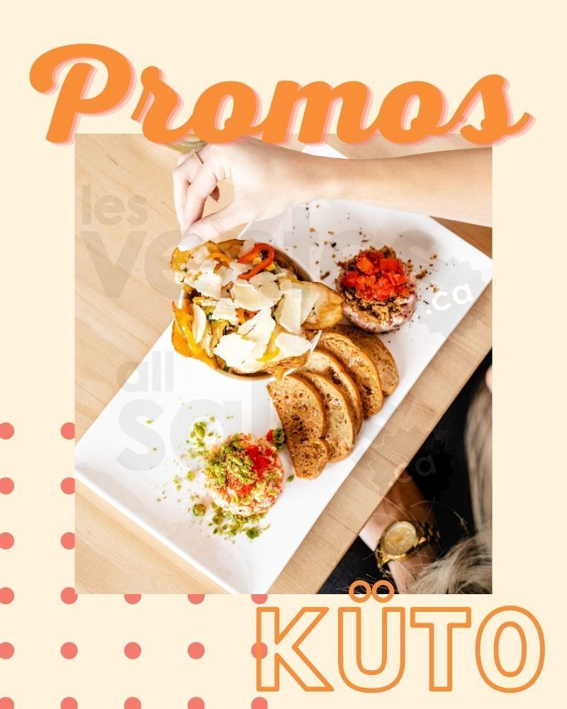 Profitez de plusieurs promos chez Küto! Dimanche les tartares sont à 17$, mardi profitez du Terre & Mer à 19$, mercredi obtenez 3 tartares et un accompagnement pour 25$, jeudi les poké bols sont à 18 $ et mangez pour 18$ tous les midis.
