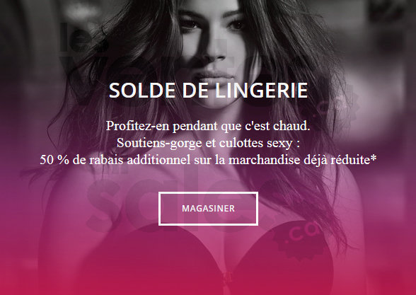 Solde de lingerie chez Addition Elle. Pour un temps limité, profitez d'un rabais additionnel de 50% sur la marchandise déjà réduite : soutiens-gorge et culottes sexy!*