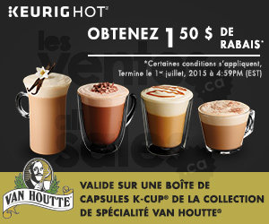 * L'offre est disponible du 15 mai 2015 à 17 heures (HAE) au 1er juillet 2015 à 16 h 59 (HAE) ou jusqu'à épuisement des stocks. Exclusivement en ligne sur Keurig.ca. Le code coupon PENSEELATTE s'applique au moment du paiement. Le rabais de 1,50 $ par boîte peut être appliqué sur un maximum de huit (8) boîte de capsules K-Cup® de la collection de spécialité Van Houtte®. Cette promotion ne s'applique pas aux achats antérieurs. L'offre peut être modifiée ou annulée sans préavis. Des frais d'envoi supplémentaires peuvent s'appliquer aux endroits situés à l'extérieur des zones métropolitaines. Ne peut être combinée à d'autres offres, coupons ou promotions.