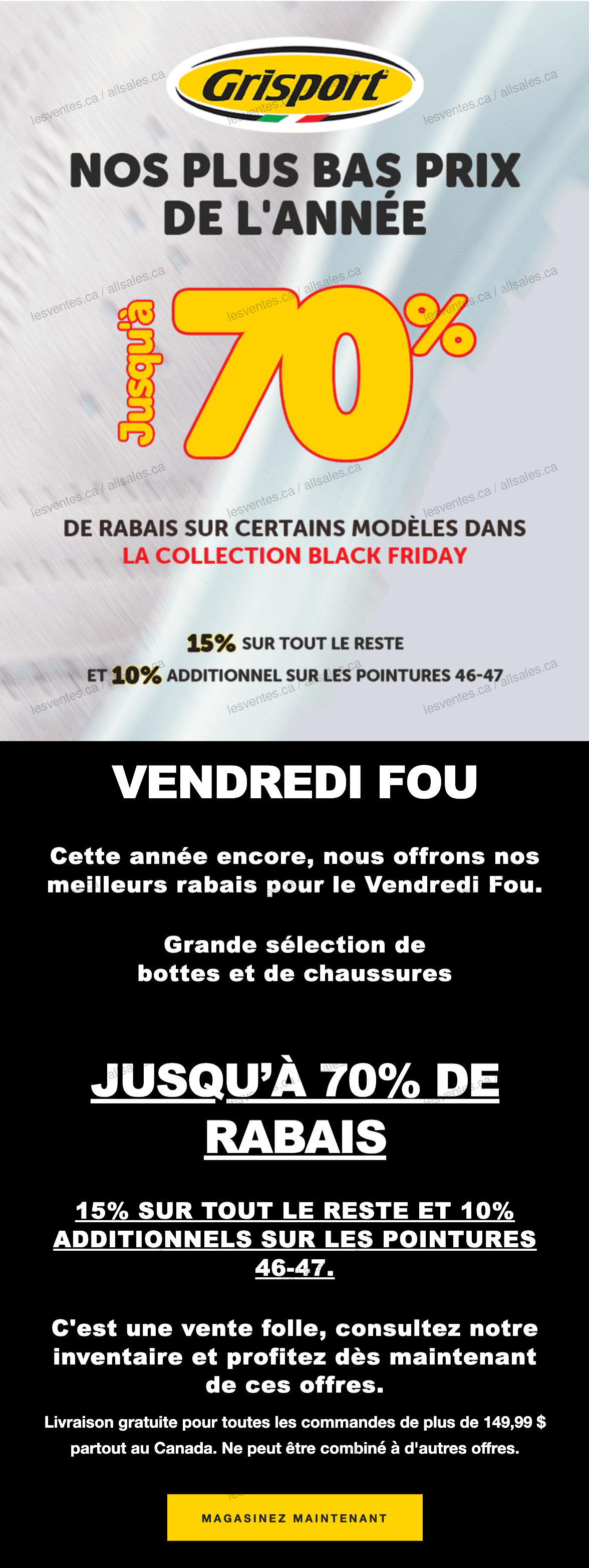 Vendredi Fou: jusqu’à 70% sur bottes et chaussures Grisport, 15% sur tout le reste + 10% extra sur les pointures 46-47! Vente incroyable en magasin et en ligne.