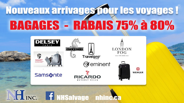 Nouveaux arrivages chez NH Inc.! Économisez de 75% à 80% sur un vaste choix de valises des marques reputées telles Samsonite, Smart Luggage, Delsey Paris, Atlantic, Travelpro, London Fog, Ricardo Beverly Hills, Wenger, eminent.