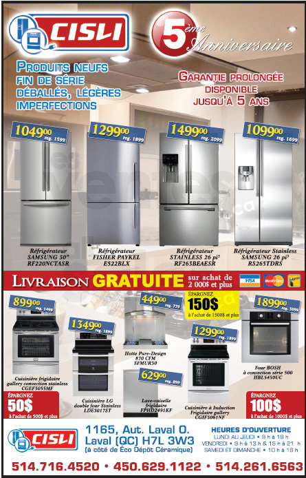 Une visite à notre centre de liquidation CISLI s'impose pour voir nos spéciaux. Économisez sur des réfrigérateurs, fours, plaques de cuisson, lave-vaisselle, micro-ondes: GE Profile, Bosch, LG, Samsung, Pure Design & plusieurs autres marques.