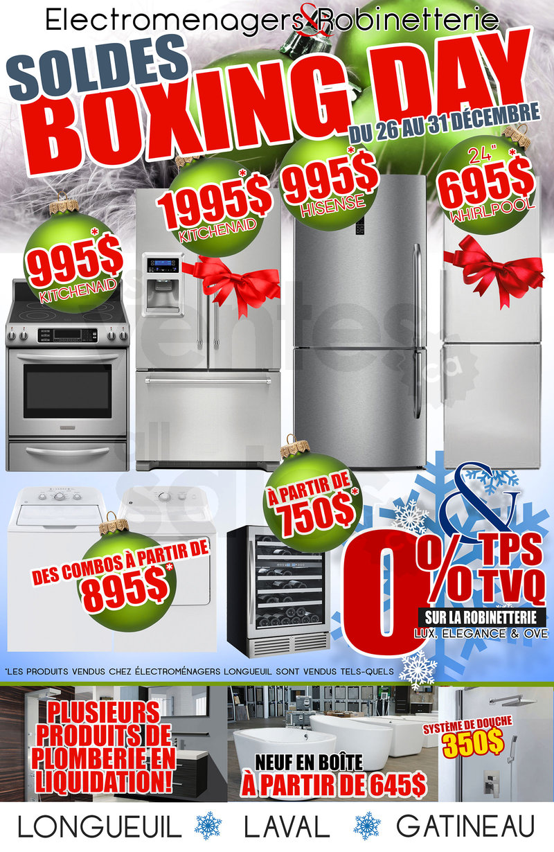 Soldes Boxing Day Électroménagers & Robinetterie! Cuisinière KitchenAid 995$, réfrigérateur 2 portes KitchenAid 1995$, réfrigérateur HiSense 995$, combo laveuse-sécheuse à partir de 895$, système de douche 350$, bain à partir de 645$ et plus encore!